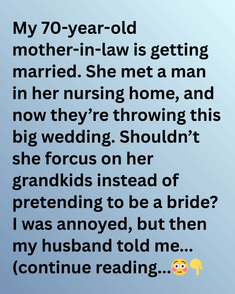 She met a man at her nursing home, and suddenly, there was all this talk of wedding dresses, flowers, and a celebration. Honestly, I couldn’t wrap my head around it. At her age, wasn’t it more appropriate to focus on spending time with her grandchildren than walking down the aisle like a young bride?