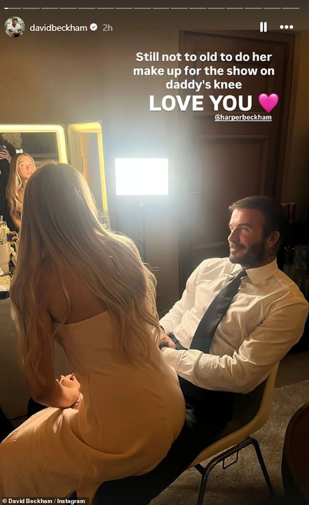 Beaming with pride, David captioned the photo: “Still not too old to do her makeup on Daddy’s knee before the show ❤️ Love you @harperbeckham.”
