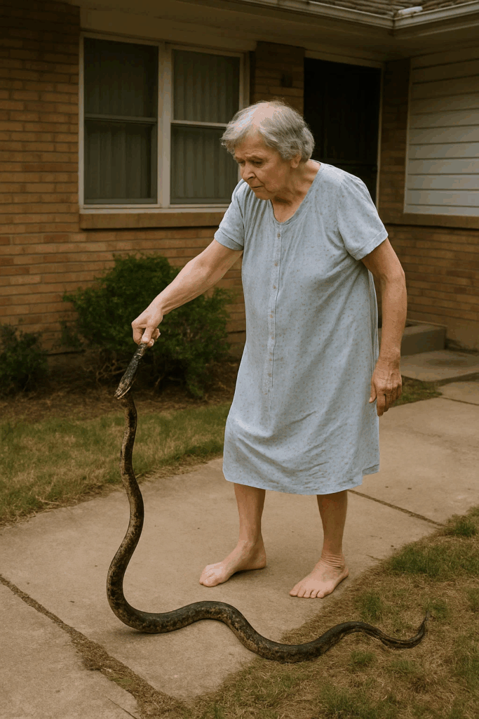 Her daughter shared the incredible story online, posting a picture of the fearless woman standing in her driveway, holding the snake by the tail and inspecting one of the bites on her arm.
