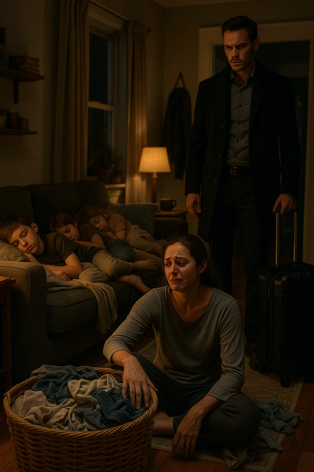 I never imagined that eleven years of marriage could fall apart in a single night—but it did. I can still hear the sound of David’s suitcase wheels scraping across the hardwood, echoing through the house like a slow, mournful procession. Our four children—Ethan, 10; Chloe, 8; twins Ava and Liam, 5—were already asleep, blissfully unaware that their father was about to walk out of their lives.